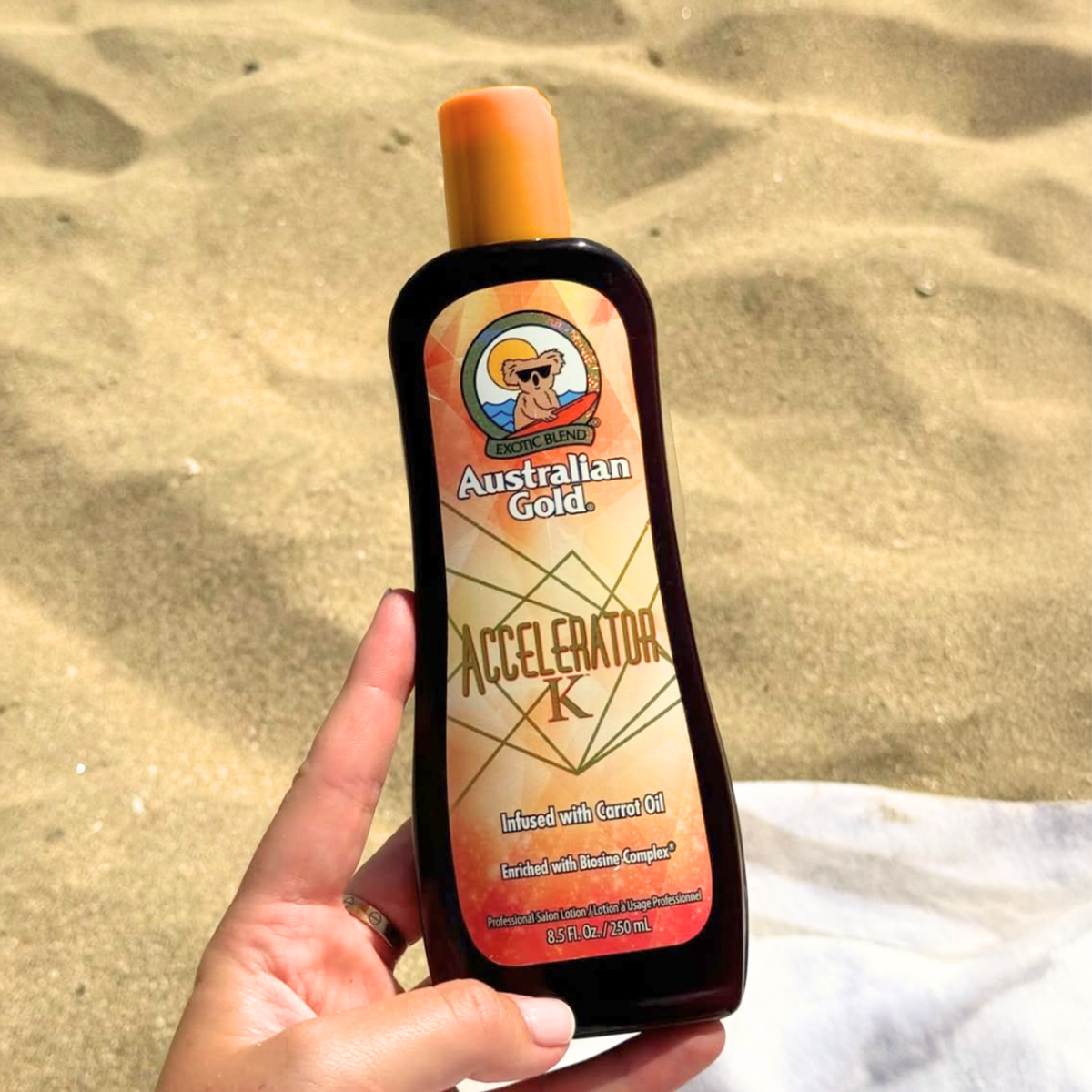 Australian Gold 'Accelerator K' zonnebrandcrème heeft als basis de ‘Triple Carrot Blend’ (o.a. wortelolie en wortel extract) waardoor je lekker snel een tropisch donkere kleur ontwikkelt. Het exclusieve Biosine Complex zit boordevol voedingsstoffen en vochtinbrengende ingrediënten om de huid maximaal te hydrateren. Anti-aging skincare zoals Kakadu Plum (Australische oliën en vitamines) en de Skin Softening Blend (amandel-, kokos- en saffloerolie, vitamines en Aloë Vera) helpen bij het bevorderen van een stralende jong uitziende huid en werken tegen lijntjes en rimpels. Wordt snel in de huid opgenomen, niet vet, plakt niet. Tan Fresh formule, ‘Cocoa Dreams’ geur. Flacons 250 ml, sachets 15 ml.